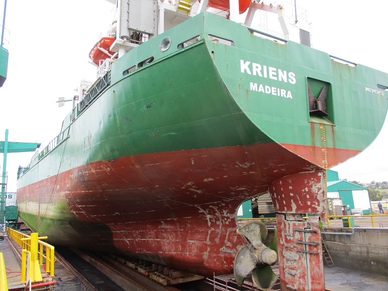 Carguero de 119 m «Kriens» Reparaciones y mantenimiento, Varadas Varada para mantenimiento y reparaciones Limpieza, chorreado y pintado del casco, limpieza cadenas, pintar ancla, renovar apoyo y goma de las tapas de escotilla, renovar/reparar tuberías cámara de máquinas, etc